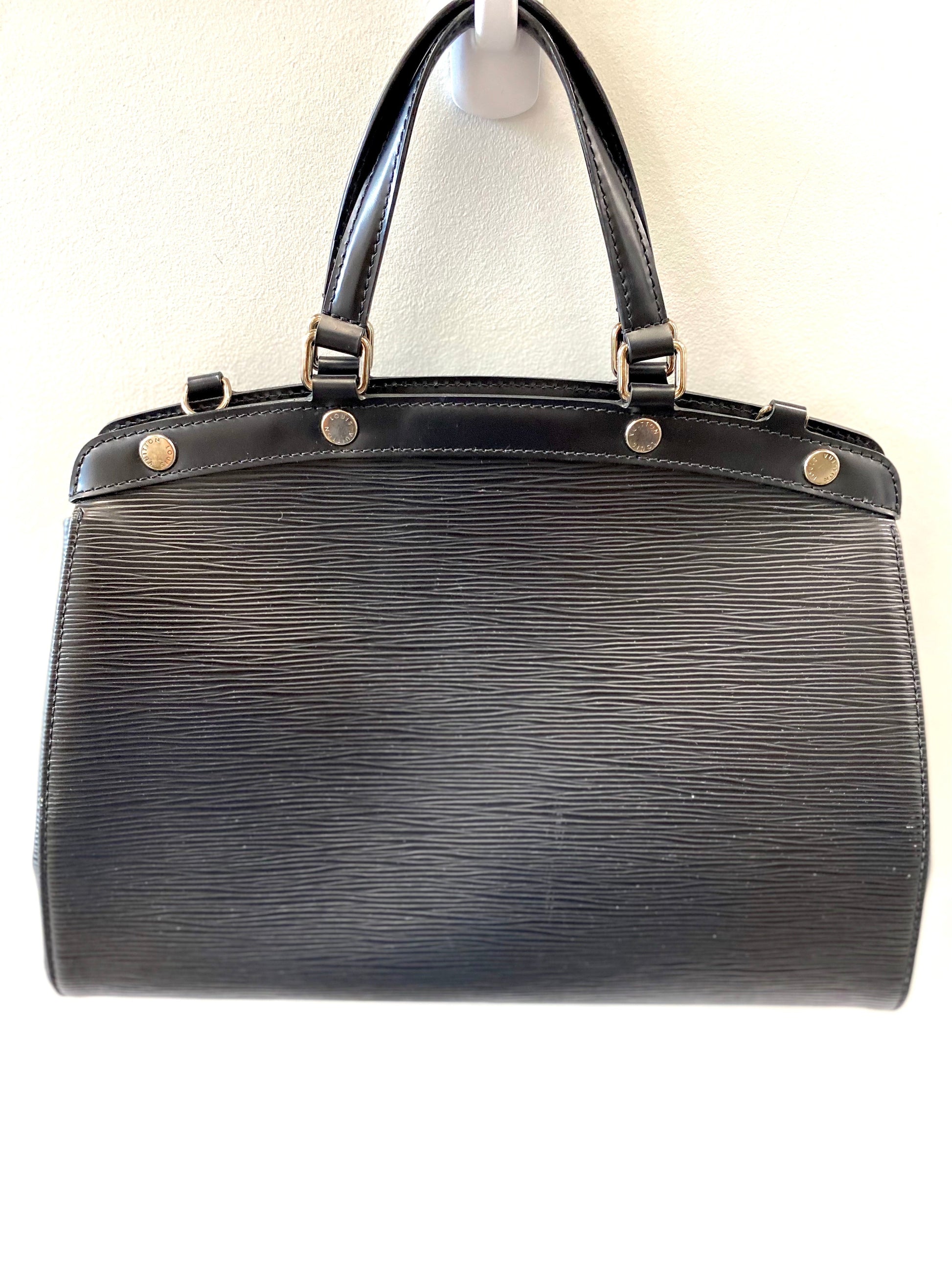 This stylish Handbag is crafted of EPI Leather in Black. The bag features strap handles, a fabric interior with a zipper, and patch pockets.