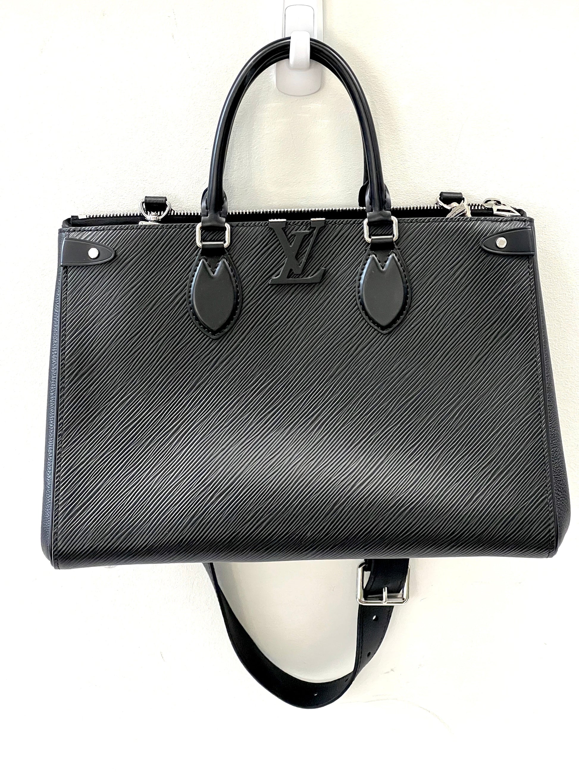 The Grenelle Tote MM bag is made from EPI- Grained leather, and adorned with tone-on-tone LV Initials. Its square shape and leather gussets mean this bag is roomy enough to hold a laptop or notebook. The removable leather strap ensures comfortable shoulder and cross-body carry while the leather top handles enable hand and elbow carry.