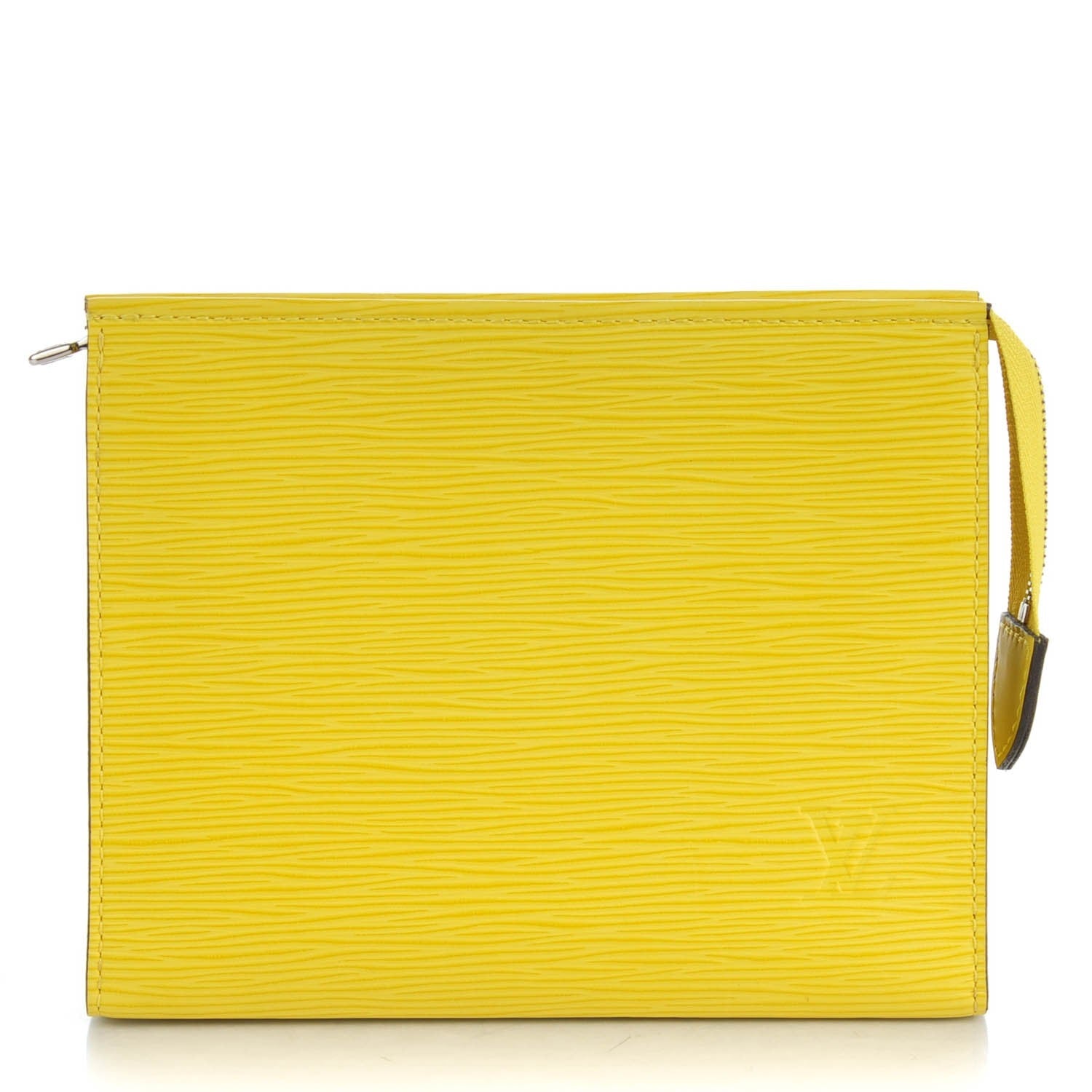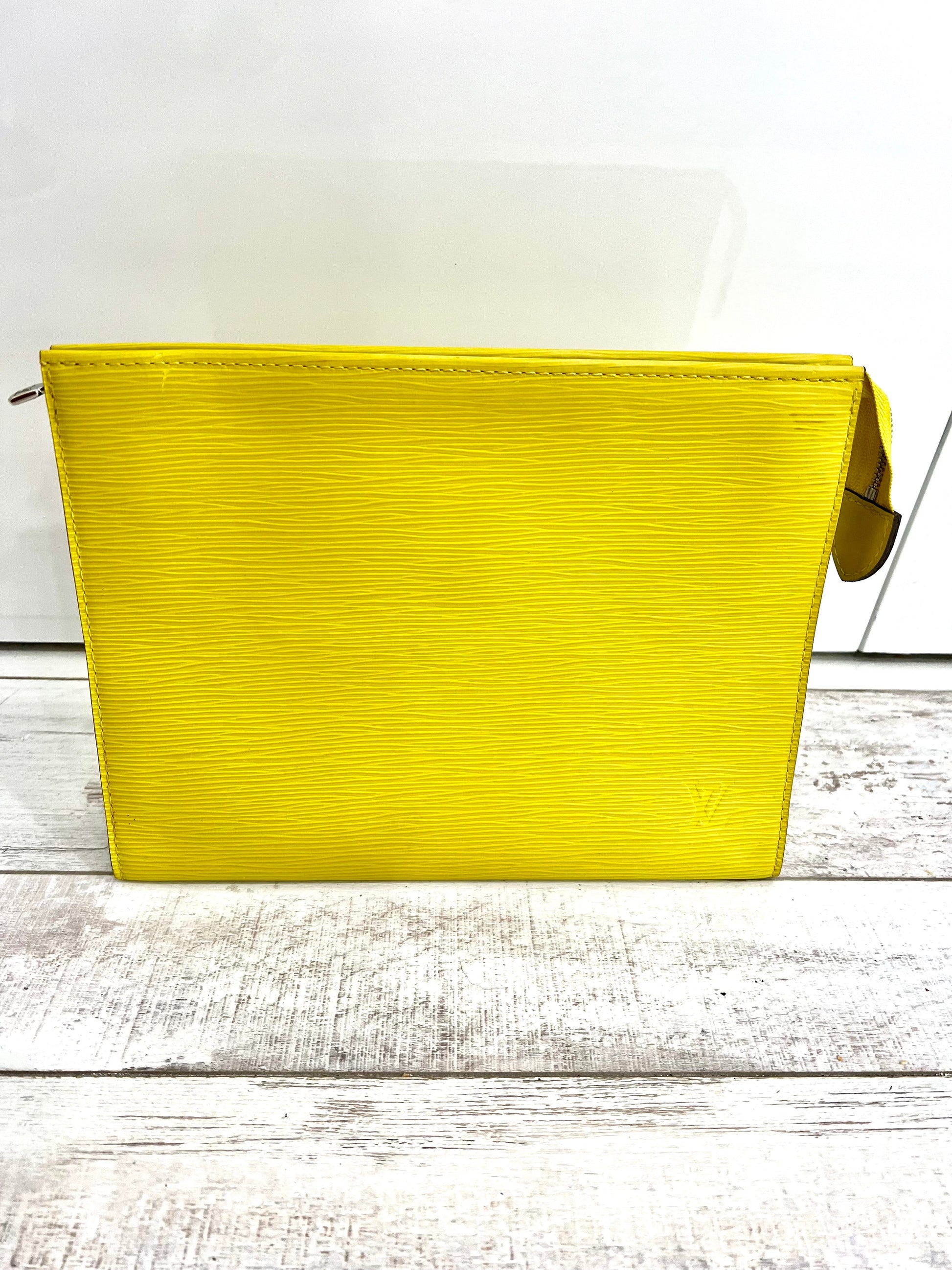 This is a chic toiletries case from Louis Vuitton that is stylish as well as fabulously functional. The case is made of beautiful textured epi leather in yellow with a sturdy front and rear and flexible sides. The case has a silver top zipper that opens to matching leather interior that is resistant and sturdy.