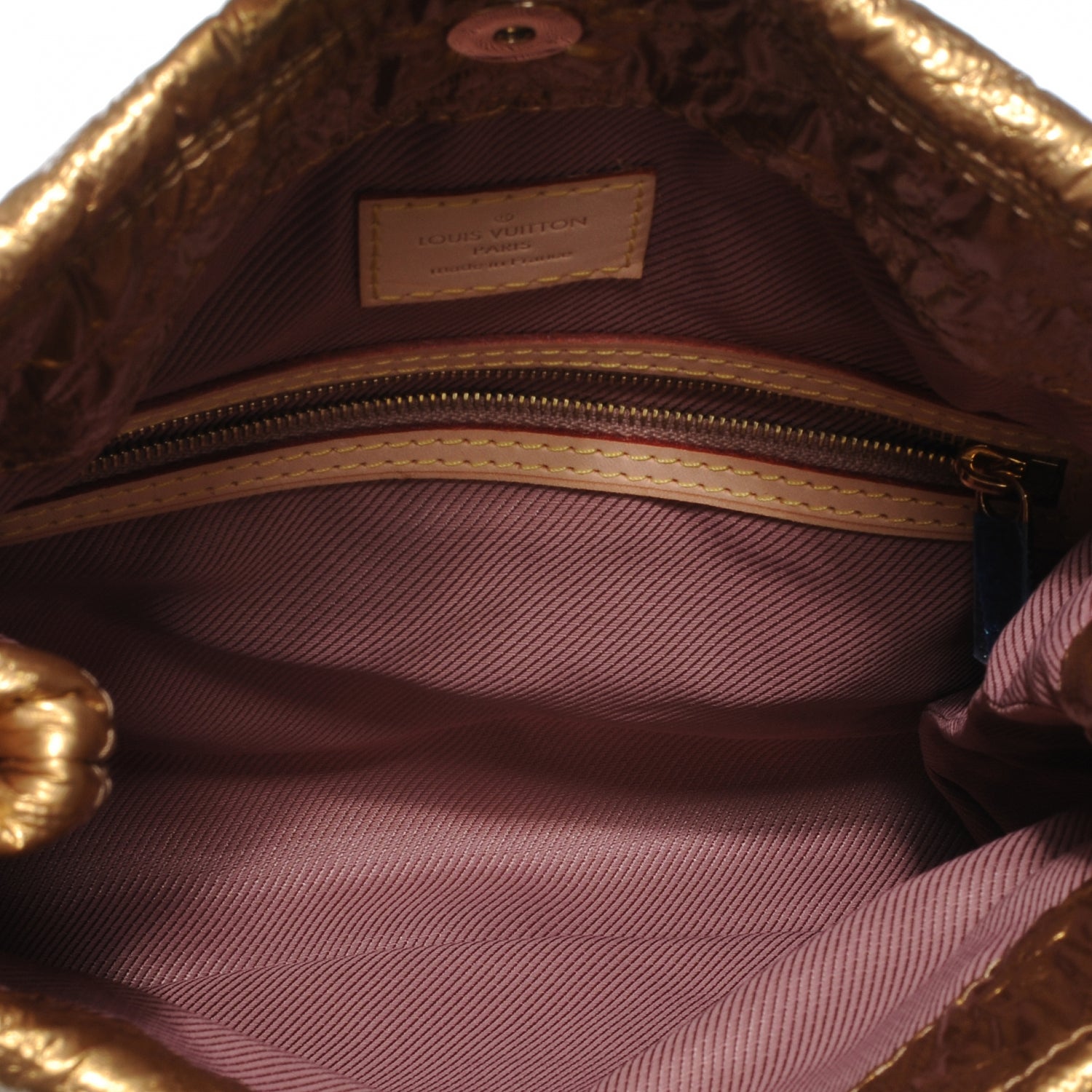 This Stunning Fold-over Clutch Bag is Crafted of Brocaded Monogram Quilted fabric in Gold. The fold over top opens and unsnaps to a pale mauve canvas interior with a zippered pocket.