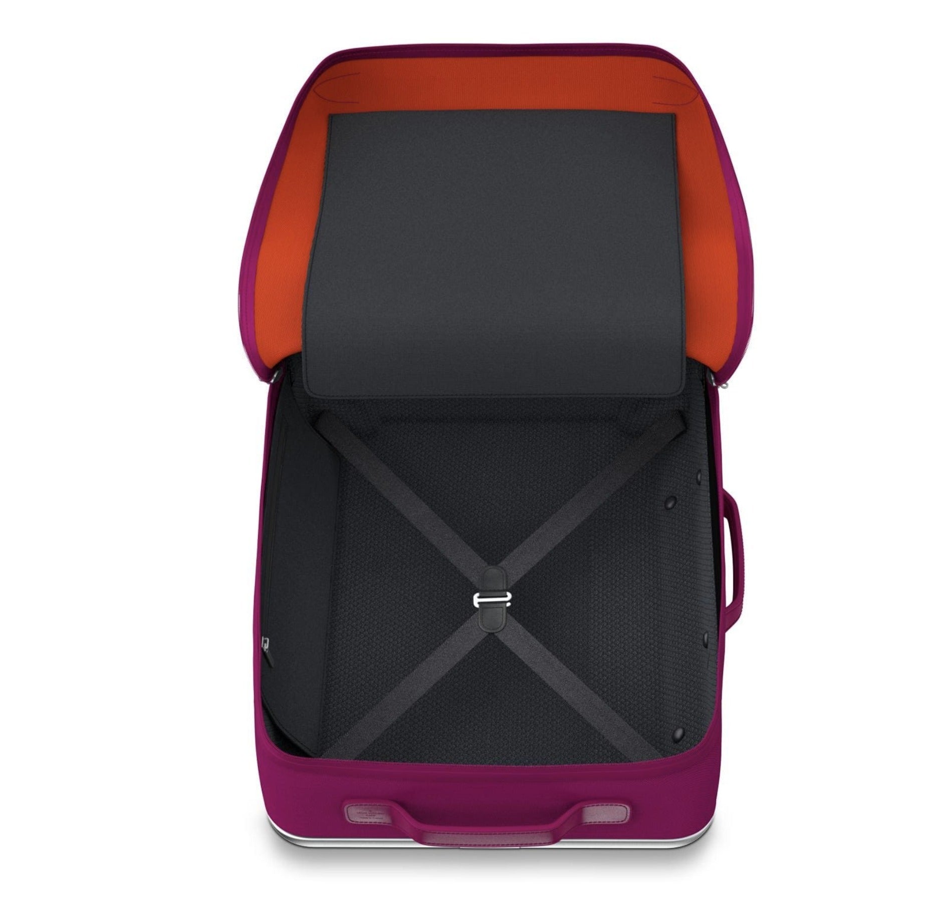 This rolling luggage has two side handles, a telescoping pull-out handle, 4 wheels, brushed silver hardware, and a front pocket. The wrap-around zipper opens to a black fabric interior with elastic bands and a small zipper pocket to secure belongings.