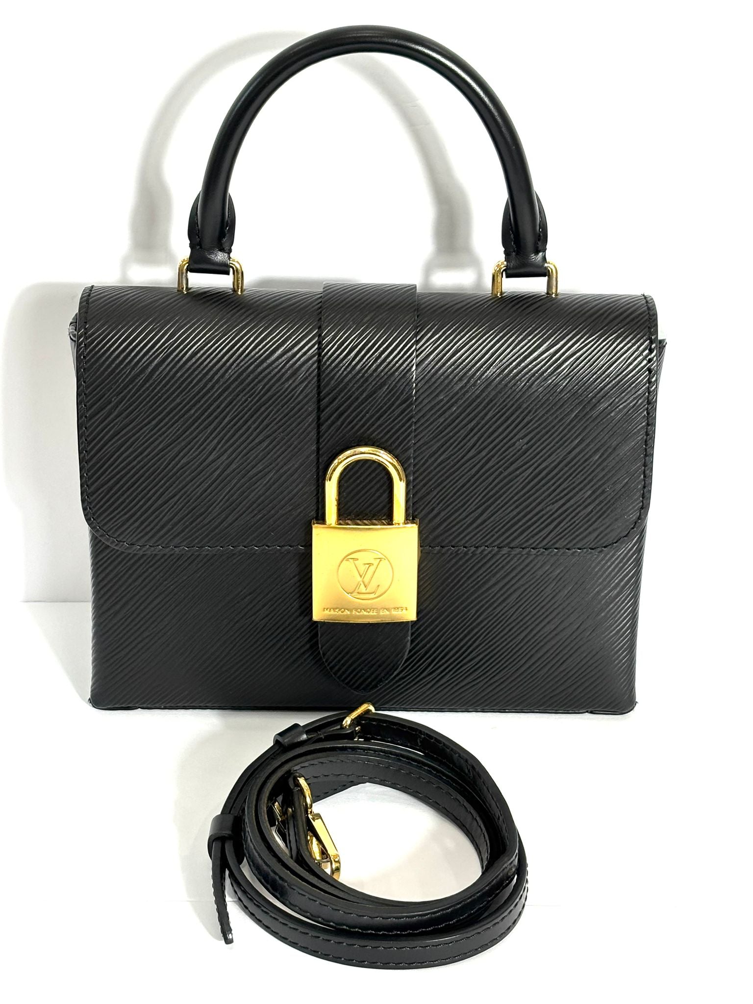 From Louis Vuitton's 2021 collection, this elegant top handle bag is crafted from signature black Epi leather—renowned for its textured, durable finish. Accented with polished brass hardware, it features a structured silhouette with a rolled leather handle and a front snap closure for a timeless, sophisticated look.
