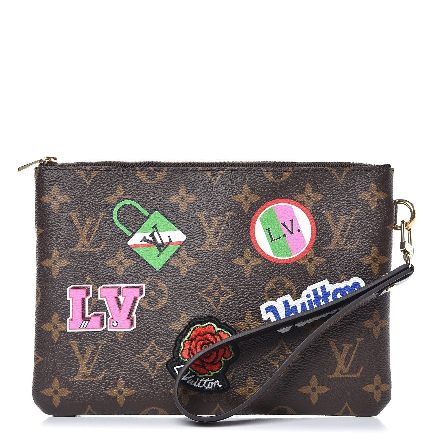 This chic pouch is crafted of traditional Louis Vuitton monogram toile canvas with embroidered patches and travel stickers inspired by those used on luggage at the end of the 19th century.
