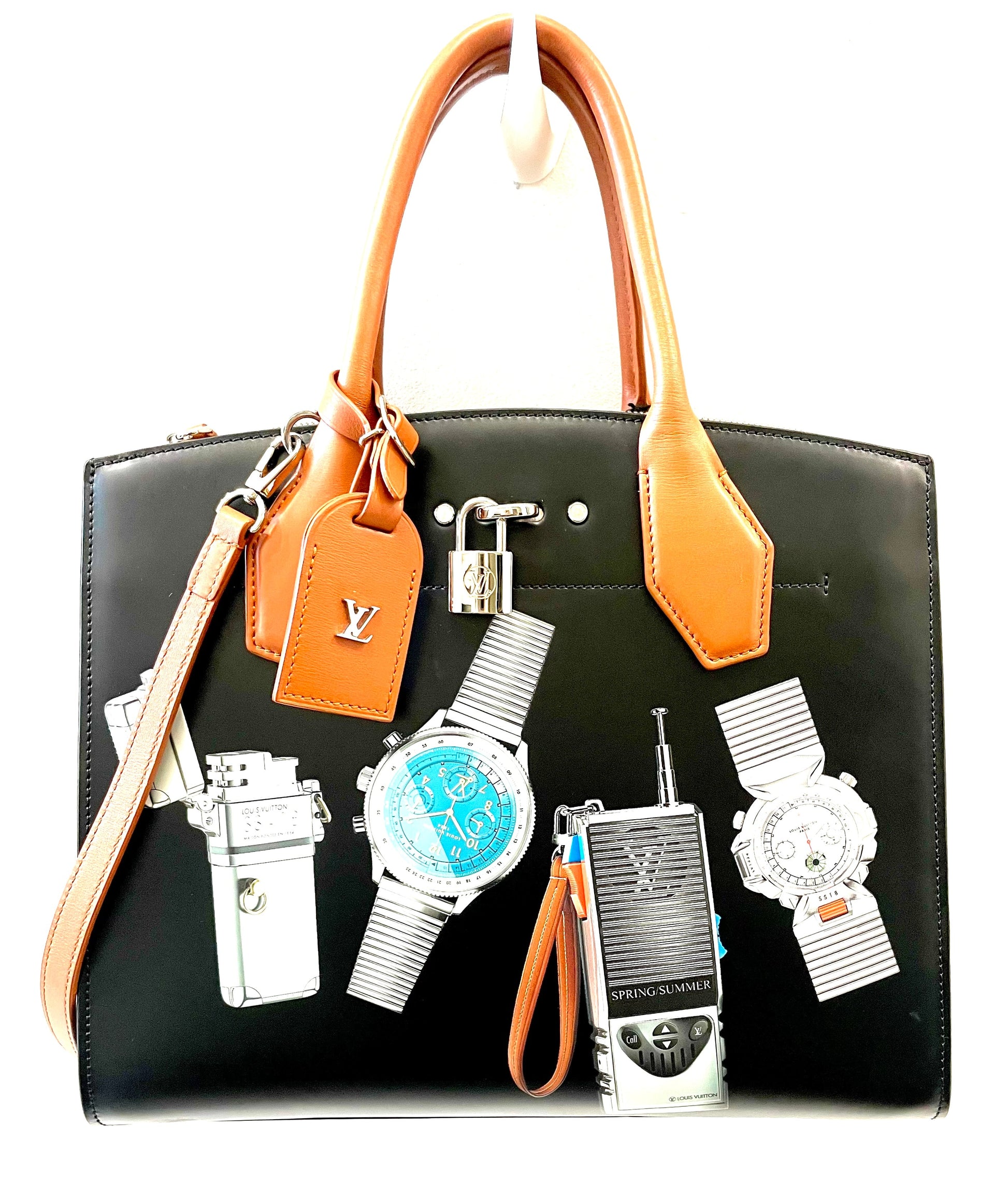 A Rare Collectible from Louis Vuitton's Pre-Fall 2018 collection, the World Tour City Steamer Tote blends Timeless luxury with whimsical charm. Crafted in rich Noir black calfskin leather, this Limited Edition piece is adorned with playful, vintage-inspired illustrations—resembling classic travel stickers such as watches, lighters, and other eclectic motifs—giving the bag a modern, artistic edge.