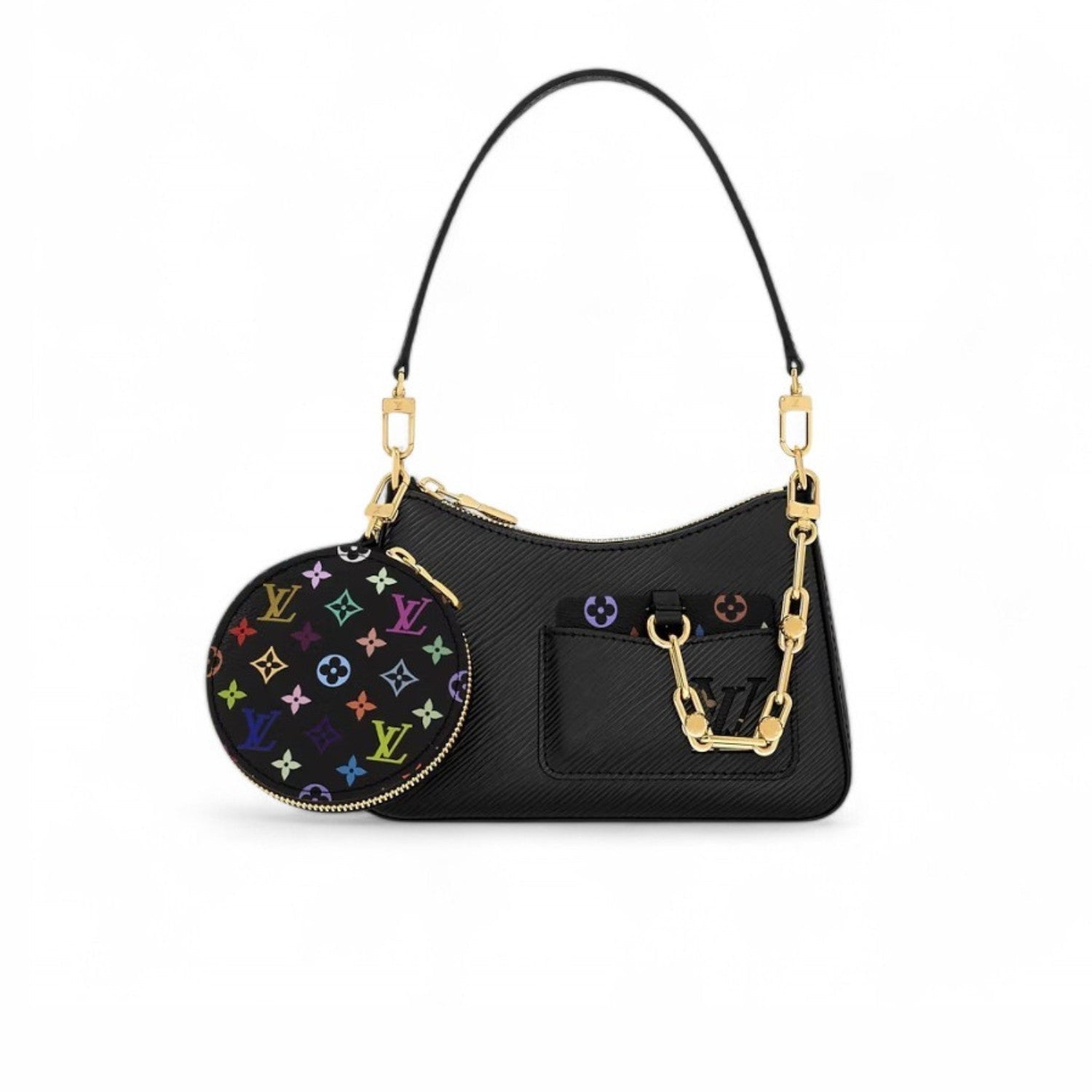 - Twisting elegance with edge, the Marellini is crafted from the House’s richly textured Epi leather in bijou proportions big enough to fit daily essentials, including a large smartphone. Rebellious chunky golden chains secure a round coin purse and a mirror to the outside, both of which strike a playful contrast in the Louis Vuitton x Murakami collection’s multicolored Monogram canvas.