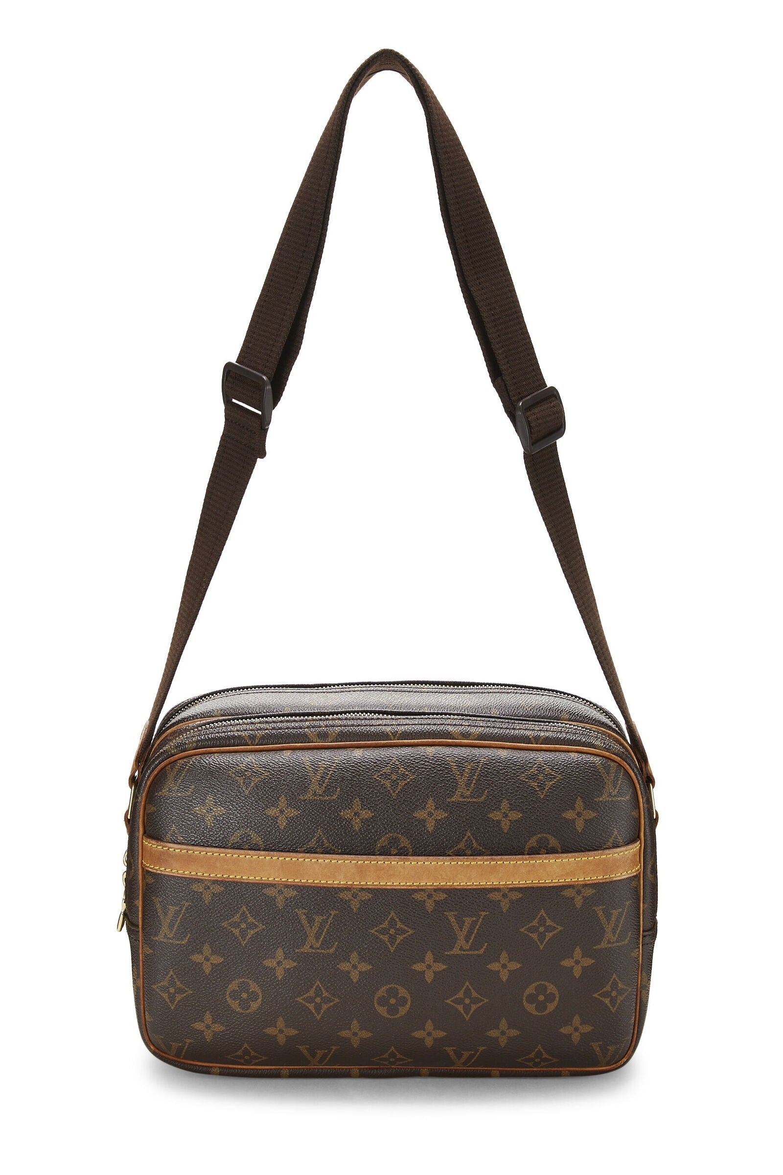 Louis Vuitton's Reporter bag is crafted in iconic Monogram coated canvas, featuring natural Vachetta leather trim and finished with gold-tone metal hardware accents. This bag also features an adjustable canvas strap for comfort and versatility.