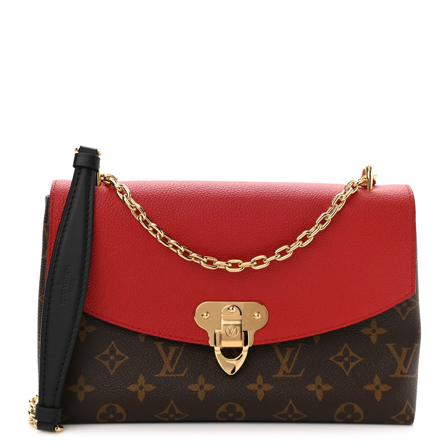 This Stylish Louis Vuitton Saint Placide Shoulder Bag is crafted from Classic Monogram canvas in brown, complemented by a vibrant Red Grained leather front flap.