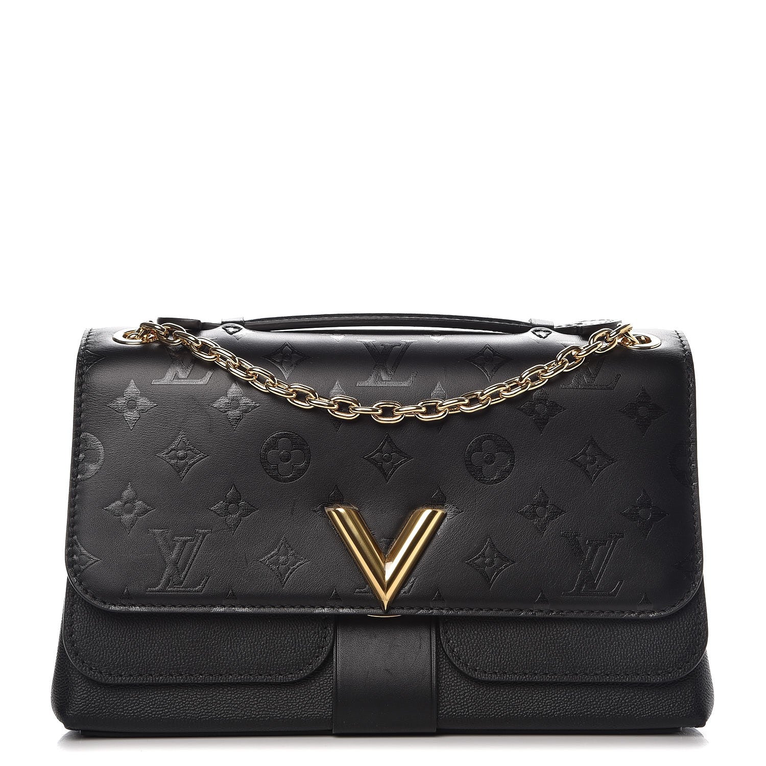 This Stylish shoulder bag is crafted of soft calfskin leather in black with a discreet LV monogram. The bag features a polished gold chain link shoulder strap and a polished gold Louis Vuitton V signature logo on the front flap. This opens to a partitioned black microfiber interior.