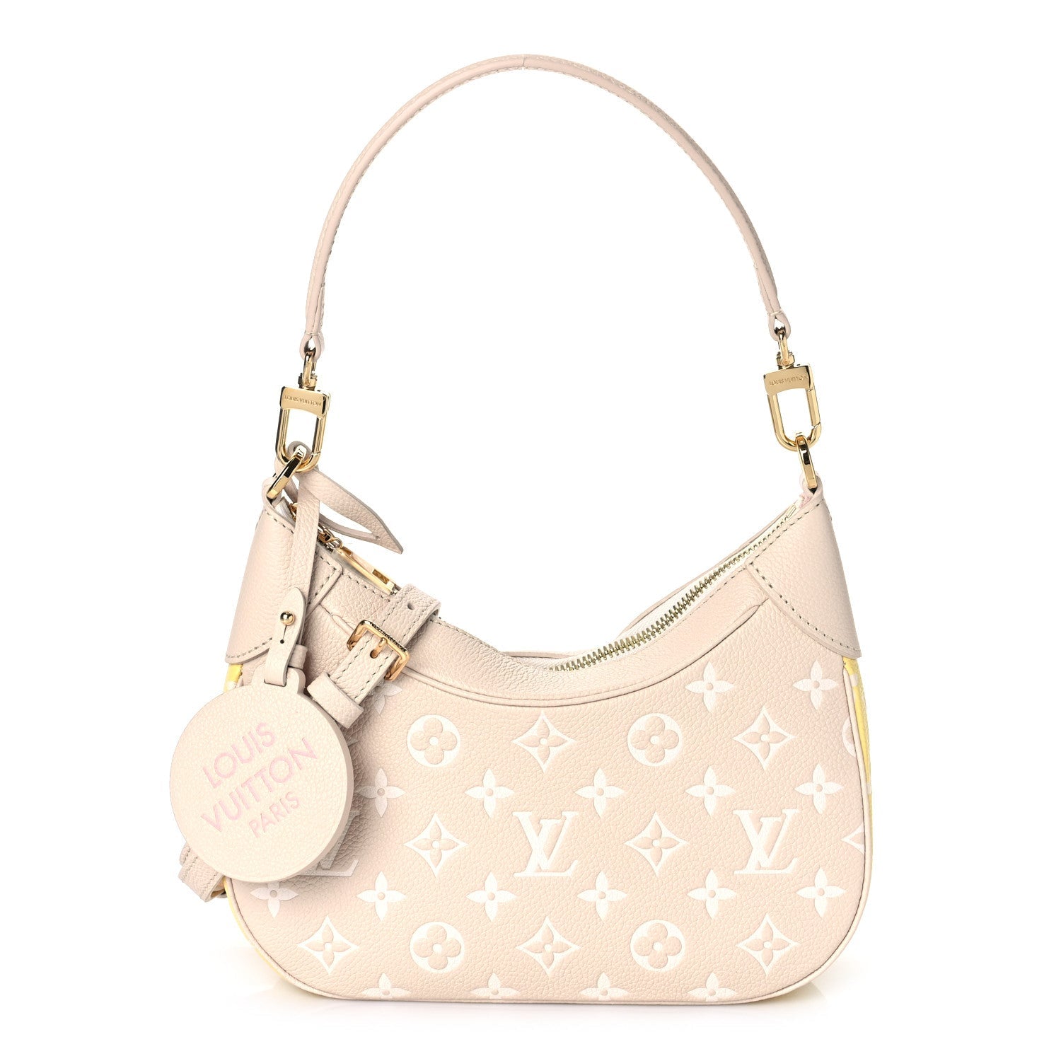 LOUIS VUITTON Empreinte Monogram Spring in the City Bagatelle NM in Pink, Beige and Yellow. This stylish mini hobo is part of the Louis Vuitton Spring 2022 “Spring in the City” collection. This chic shoulder bag features a classic Louis Vuitton monogram print on multi-colored calfskin leather. The bag features a beige adjustable leather strap handle and an optional matching adjustable shoulder strap with polished gold-tone hardware. The top zipper opens the bag to a pink microfiber interior with a slip pocket.