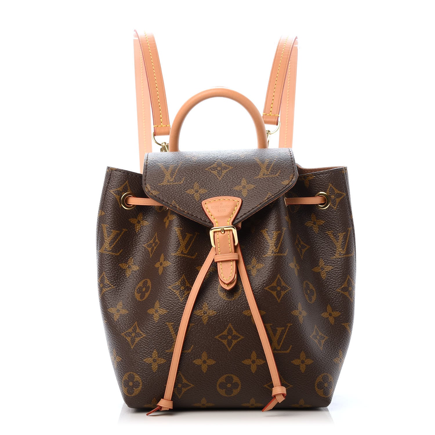 This Stylish Backpack is Crafted of Monogram-coated canvas and features Vachetta shoulder straps, a cinch cord, a top handle and brass hardware. The flap opens to a cocoa-brown fabric interior.