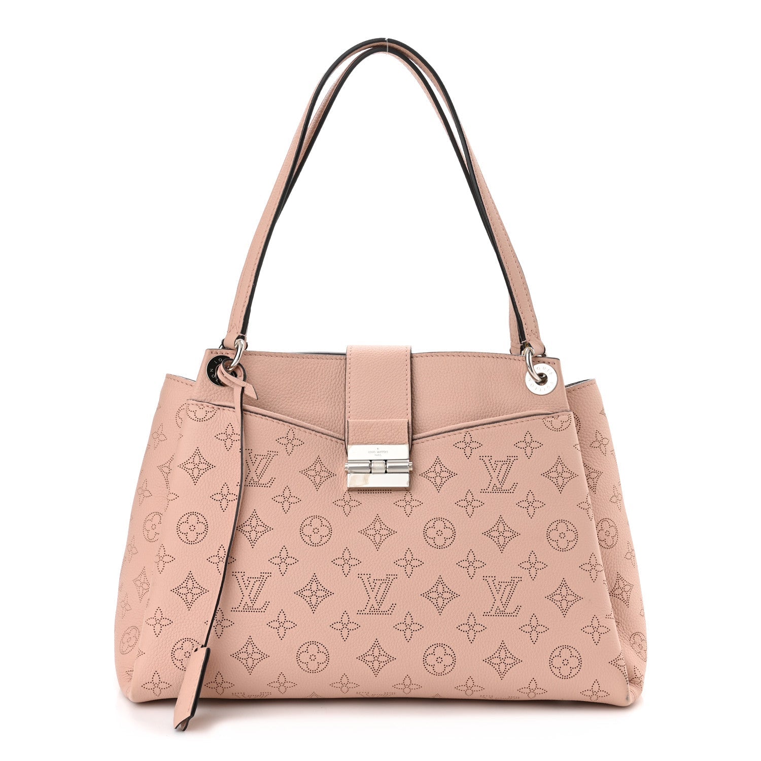 Stylish Sevres Bag rendered in Louis Vuitton's pale pink perforated Monogram Mahina leather, featuring contrasting deep brown piping and finished with silver-tone brass hardware.