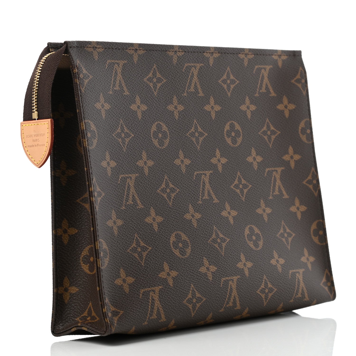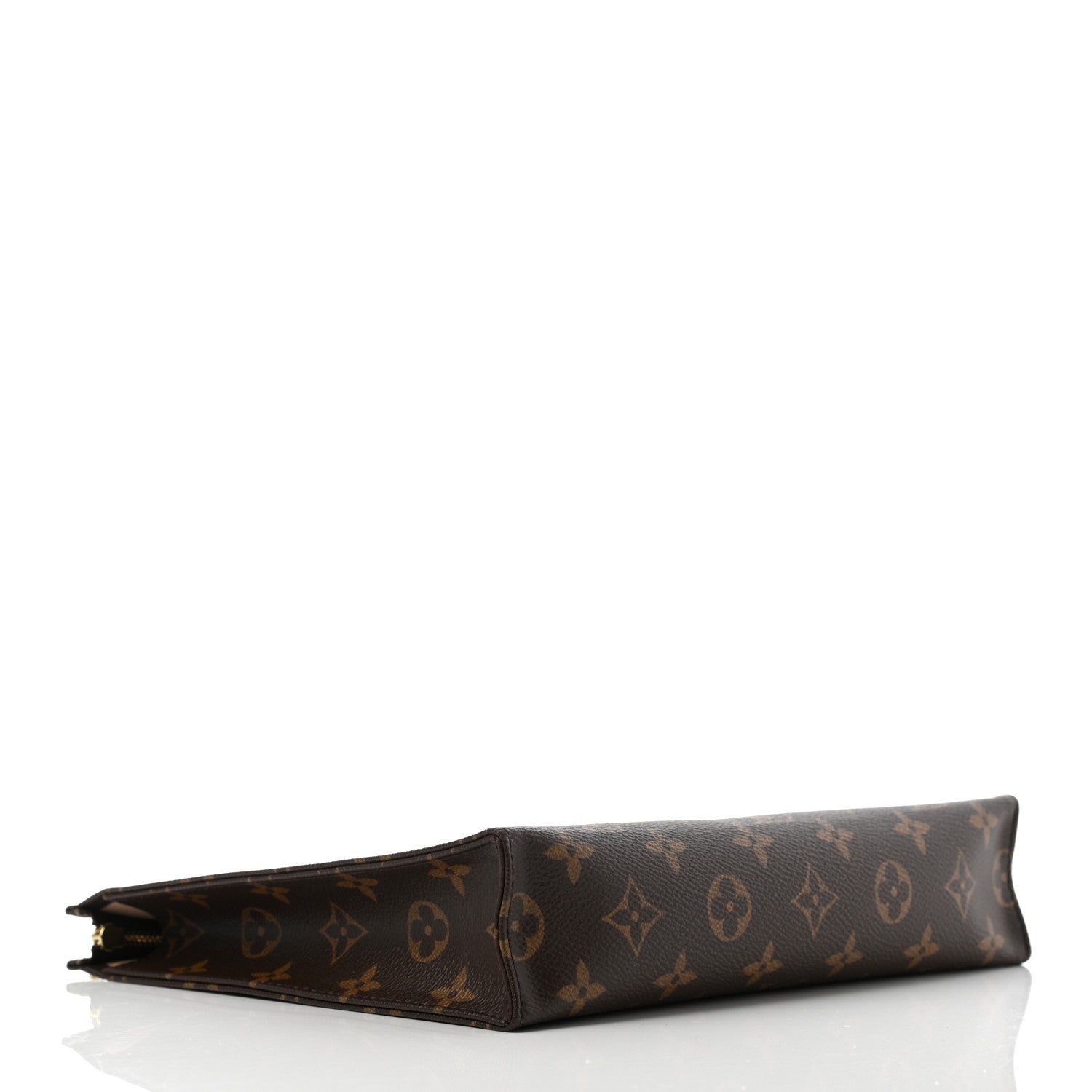 This travel pouch is crafted of traditional Louis Vuitton monogram toile canvas. It features a top overextended zipper that opens to a spacious beige leather-like interior.