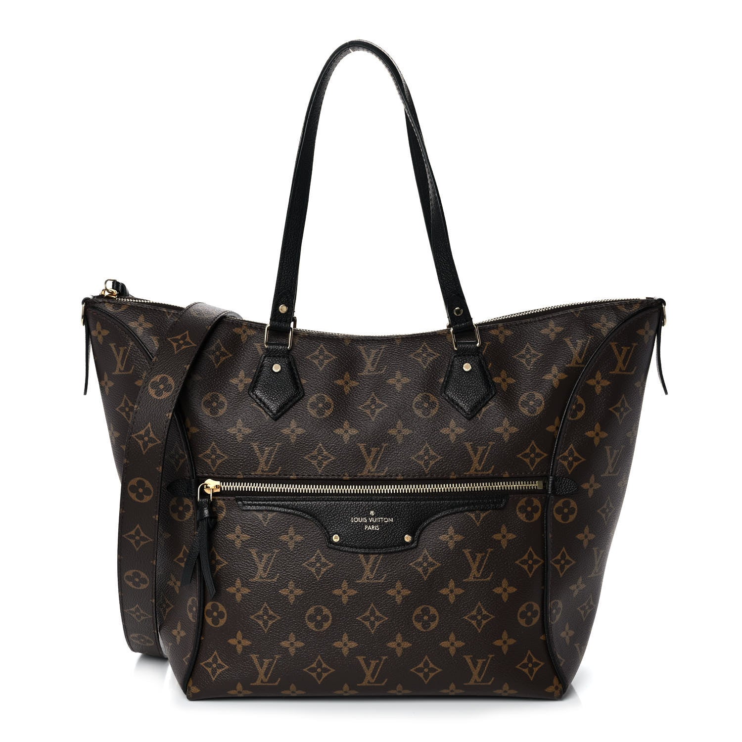 Crafted of Louis Vuitton monogram toile canvas. The bag features black calfskin leather trim and strap handles with polished brass hardware, an optional shoulder strap, and a front zipper pocket. The top zipper opens the bag to a black fabric interior with patch pockets.