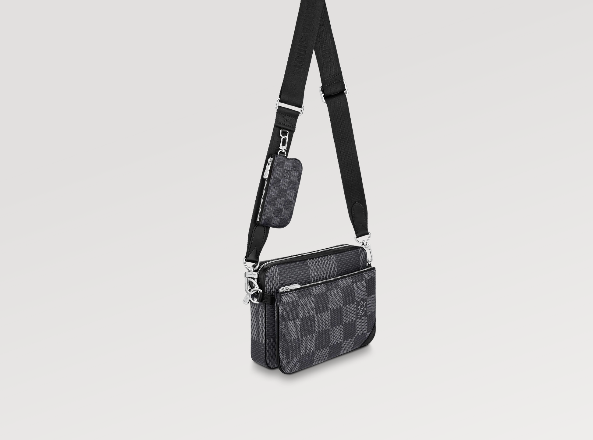 This new version of the Trio Messenger combines the versatility of a modular bag with the eye-catching elegance of Damier Graphite 3D canvas in subtle shades of gray. The removable zipped front pouch and coin purse make it a practical carrier for everyday necessities, and the adjustable strap guarantees comfortable cross-body wear.
