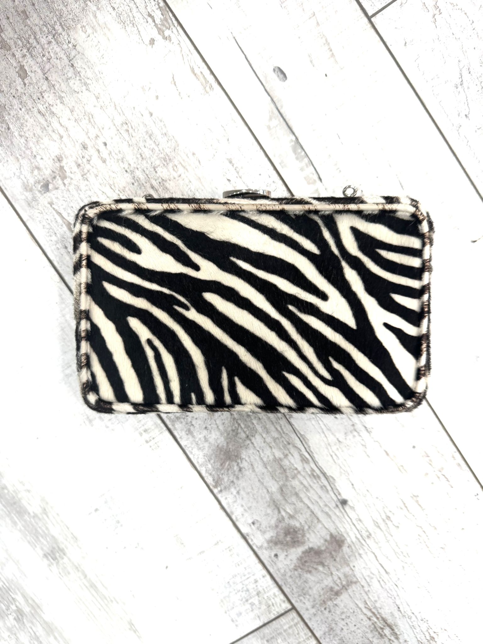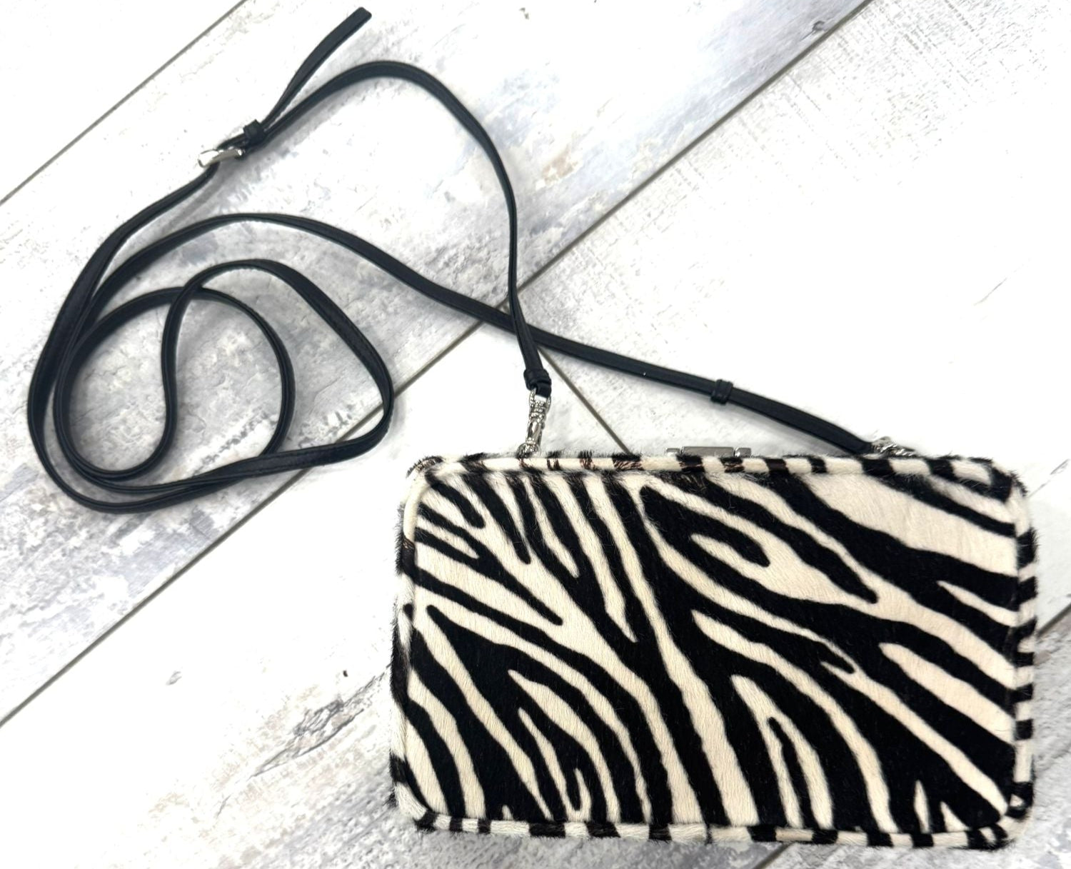 Material: Zebra-printed calf hair with leather trim