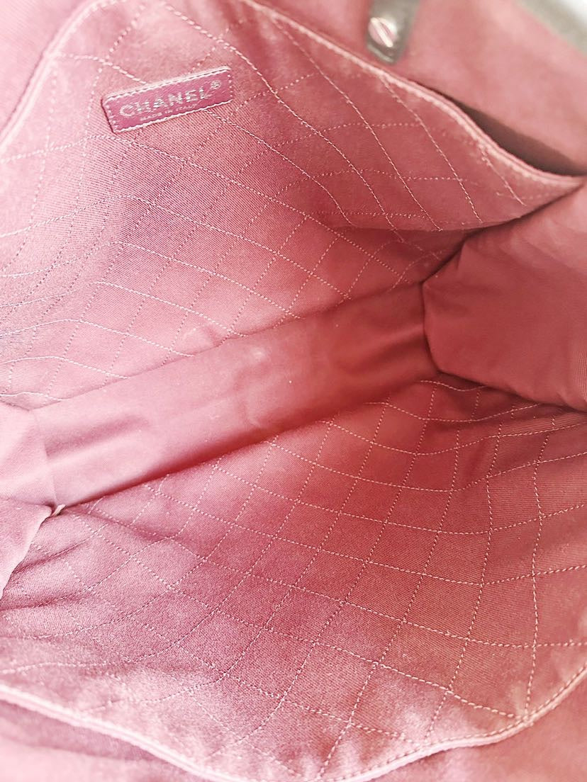 This preloved Chanel tote bag is a striking piece for any collection of designer handbags. Crafted from durable canvas, the bag features an eye-catching 5X5 = CC design. The spacious interior is lined with luxurious leather, offering ample storage for your essentials. The sturdy leather handles and silver hardware provide added elegance, making it a perfect choice for lovers of vintage Chanel bags.