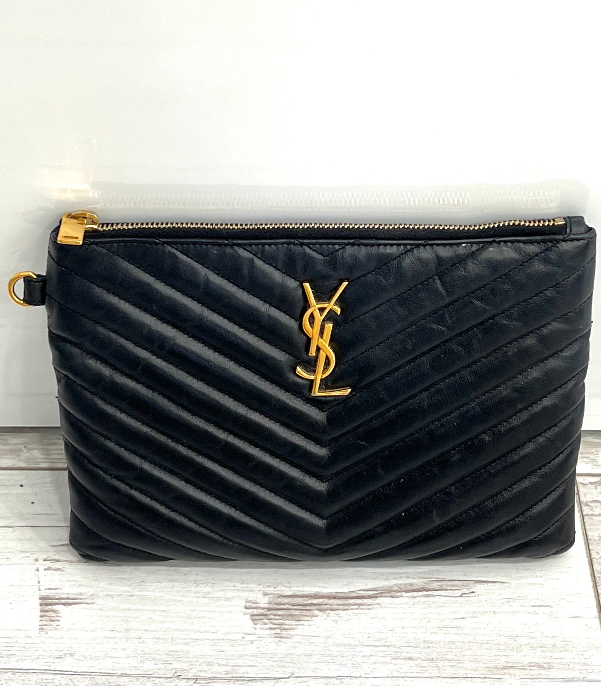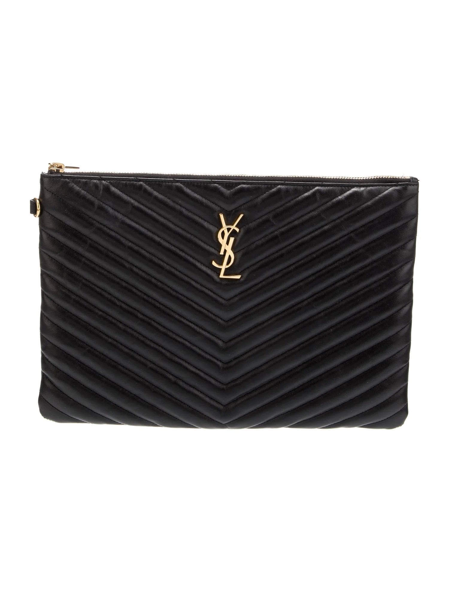 This Elegant Clutch/Pouch is Crafted of chevron-quilted calfskin leather in black. The pouch features a Gold YSL logo on the front and the top zipper opens to a black fabric interior with card slots and patch pockets.