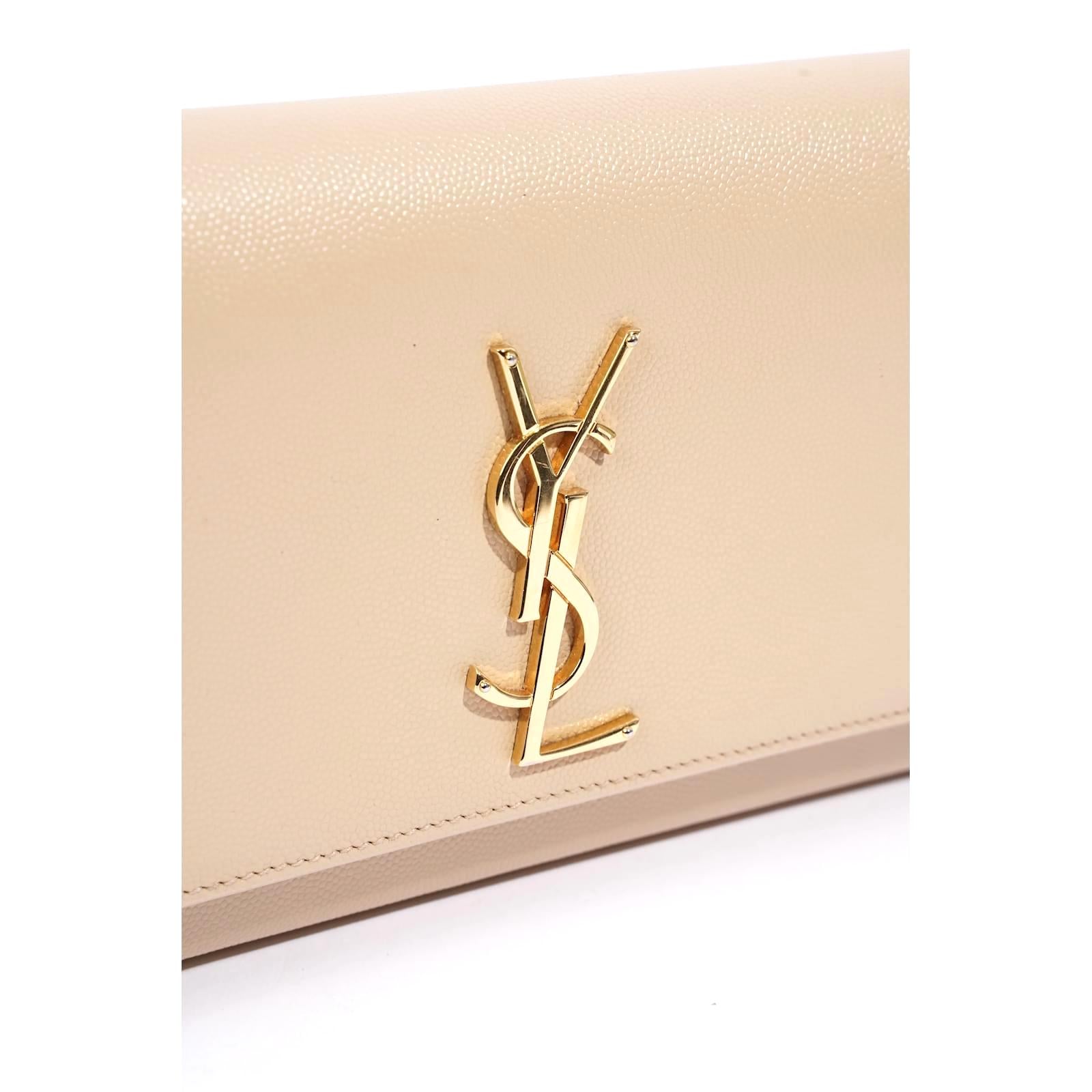 This Classic Clutch Bag is Crafted of Grain de Poudre Textured leather in Tan. The crossover flap features a prominent polished brass classic YSL monogram and opens with a magnetic snap to a black fabric interior with a patch pocket.