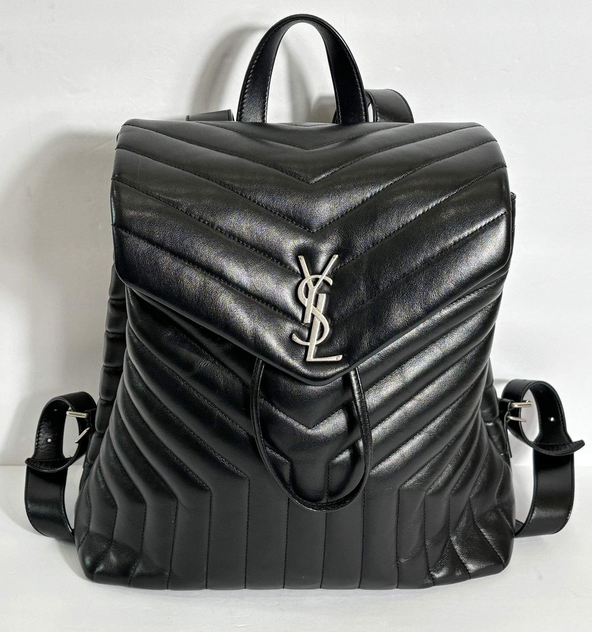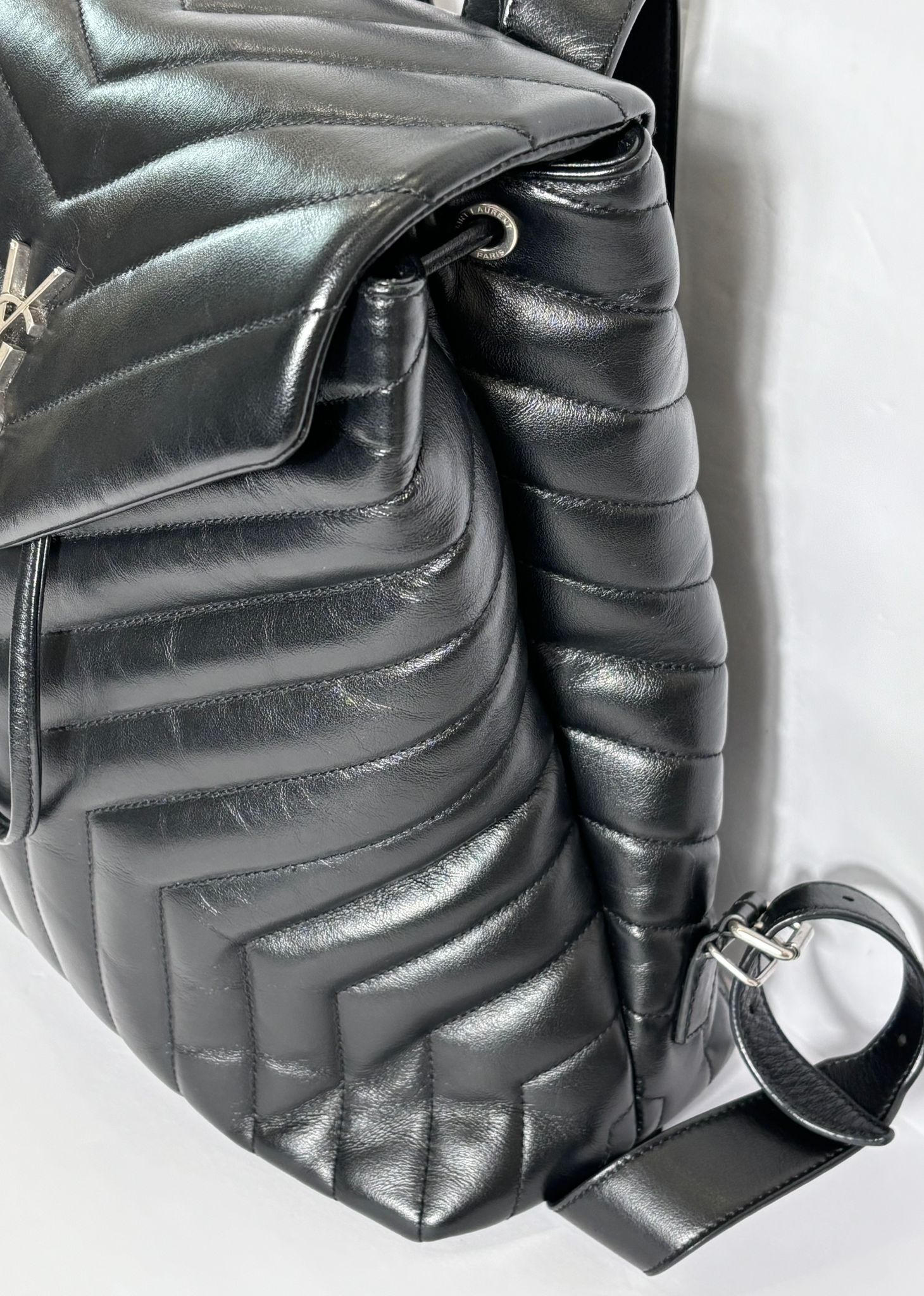 Sophisticated and modern, this Saint Laurent backpack is crafted from fine glossy black calfskin leather, offering a sleek and structured silhouette. The design features a crossover flap with a matte silver YSL logo, complemented by silver-tone buckles and hardware for a bold, polished finish.