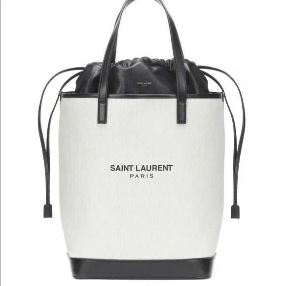 YSL Neutral White Canvas and Black Calfskin Leather Teddy Shopper Bag.